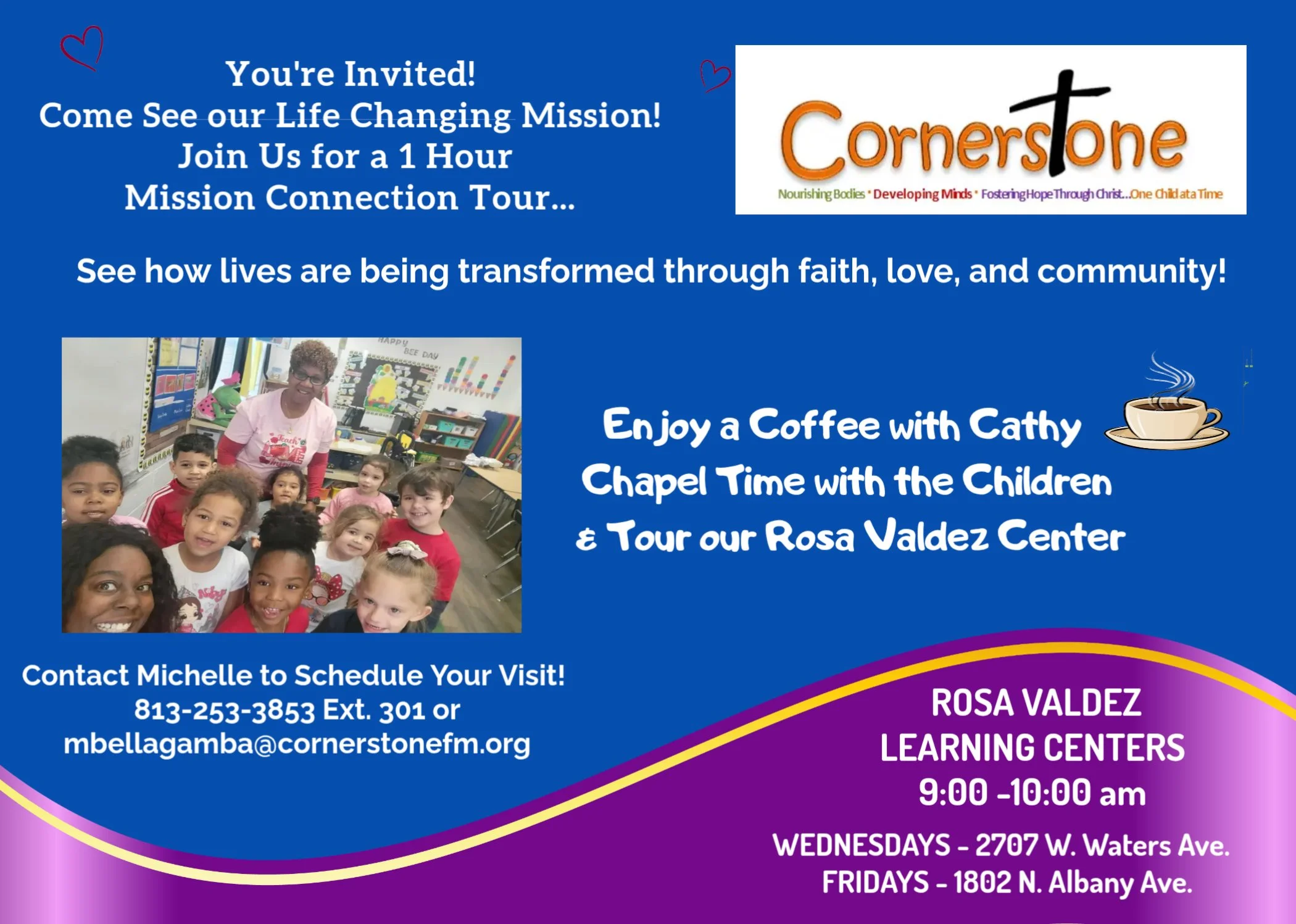 We invite you and/or your group to take a MISSION CONNECTION TOUR where you can enjoy coffee with Cathy Stone, our Executive Director and join us for Rosa Valdez Early Learning Center chapel from 9:00 am - 10:00 am.
